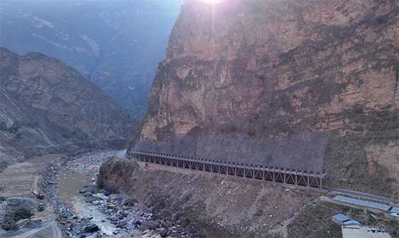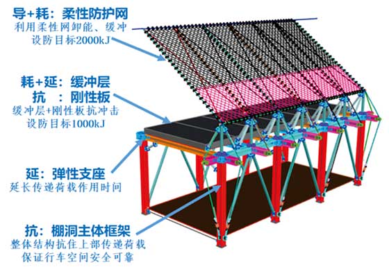 裝配式鋼棚洞聚焦應(yīng)急救援裝備配備和物資儲備,改善基層應(yīng)急救援條件,提升基層應(yīng)急救援保障能力,相較傳統(tǒng)鋼棚洞創(chuàng)新采用分級分層防護(hù)理念,結(jié)構(gòu)形式分為上、中、下三部分組合結(jié)構(gòu),合理應(yīng)用材料“導(dǎo)、延、耗、抗”特性,可根據(jù)地質(zhì)災(zāi)害能級大小,對結(jié)構(gòu)各構(gòu)件進(jìn)行選配以滿足設(shè)防標(biāo)準(zhǔn)。裝配式結(jié)構(gòu)實(shí)現(xiàn)了標(biāo)準(zhǔn)化、工廠化制作,現(xiàn)場施工快速。所有構(gòu)件均采用螺栓、銷軸進(jìn)行連接,滿足施工條件下,一節(jié)段(6m)裝配時間僅3~4小 時,極大程度降低施工風(fēng)險(xiǎn)??勺鳛橛谰媒Y(jié)構(gòu)對山區(qū)公路高位崩塌地質(zhì)災(zāi)害點(diǎn)進(jìn)行處置和臨時結(jié)構(gòu)在災(zāi)害發(fā)生后應(yīng)用于應(yīng)急搶險(xiǎn)保通。通過快速部署應(yīng)急防護(hù)棚洞,可在災(zāi)害發(fā)生后迅速構(gòu)建臨時防護(hù)體系,顯著縮短道路中斷時間,有效抵御落石沖擊,保障通行安全,便于救援力量如救援隊(duì)伍、救援車輛及物資快速到達(dá)救援現(xiàn)場,降低二次災(zāi)害風(fēng)險(xiǎn)。