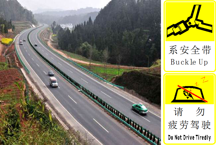 根據(jù)四川省實際情況,本項目增加“系安全帶”及“請勿疲勞駕駛”兩塊公益警告標志,“系安全帶”設于匝道收費站后,每個立交設置一塊?!罢埼鹌隈{駛”設于道路主線上,設于服務區(qū),停車區(qū)前。