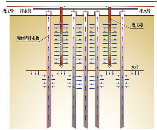 無砂增壓式真空預(yù)壓技術(shù)采用手形接頭與鋼絲軟管組成排水系統(tǒng),全面取消砂礫石墊層,通過防淤堵整體式排水板聯(lián)合增壓棒,進行間歇式增壓與抽真空,加速中深層軟土排水固結(jié),以達到復(fù)合地基處理效果,可有效解決普通真空預(yù)壓技術(shù)中塑料排水板施工工期長,排水效果不良等問題。該技術(shù)施工工期短,可循環(huán)增壓—抽取真空,工期縮短50%以上。采用水氣分離大幅提高工作效率,真空壓力分布均勻,可24小時不間斷抽取真空。工后沉降小,處理后地基承載力可達100~120kPa。