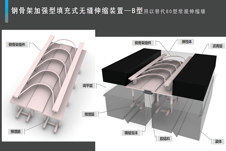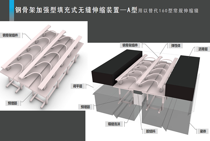 正交異性無縫伸縮裝置在對傳統(tǒng)填充式彈塑性伸縮縫病害機(jī)理深入分析研究基礎(chǔ)上進(jìn)行了重要技術(shù)改進(jìn),創(chuàng)新采用型鋼骨架與新彈塑性填充體材料,有效提升了無縫伸縮裝置的力學(xué)性能和無縫橋梁的抗震性能,簡化了施工和養(yǎng)護(hù)過程,解決了傳統(tǒng)填充式伸縮縫易脫粘、不穩(wěn)定等問題,改善了駕票舒適度,減少了橋梁結(jié)構(gòu)的次生病害,全橋無縫率達(dá)100%。該產(chǎn)品可廣泛適用于單孔跨徑不超過100m的所有橋梁,其良好的緩沖和消能作用可用于高烈度地區(qū)的中小跨徑常規(guī)橋梁。試驗橋已平穩(wěn)運(yùn)行8年整,無病害現(xiàn)象,在正常養(yǎng)護(hù)條件下,預(yù)計壽命可達(dá)15年以上。